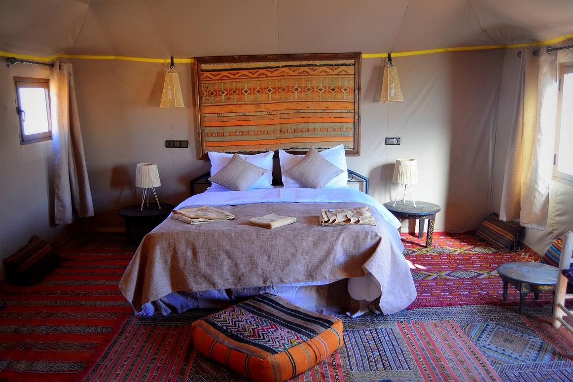 After breakfast, we'll continue on to the Dades Valley, passing via the spectacular Todra Gorges. We'll be there until midday at this point. We'll take the road to Merzouga, passing through the Palmeral de Jorf (where the best dates are claimed to be) and Erfoud, a charming village where you may see a marble workshop. Once you've arrived at Merzouga you enjoy a camel ride and the sunset on the dunes. Dinner, evening sky observation. You spend the night in a desert camp near the ERG CHEBBI sand dunes.